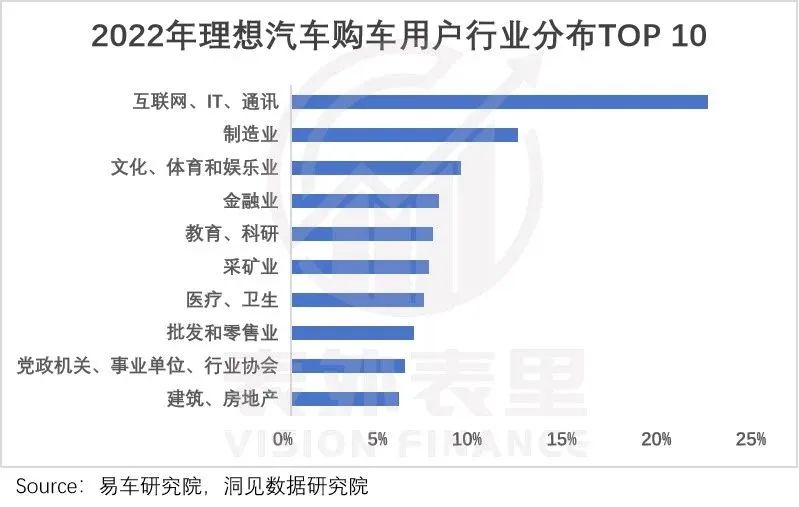 可以看到,创新者、早期采用者群体是“喜欢我就买”,对应的正是“之前购买理想的奶爸”。如下图,2022年理想的购车用户中,崇尚创新意识的互联网从业者占了大头。