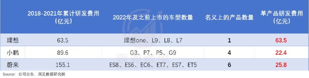 以研发来说,2018-2021年累计研发费用显示,理想是蔚小理三家中最低的,但分摊到单个产品上,理想却是最高的。