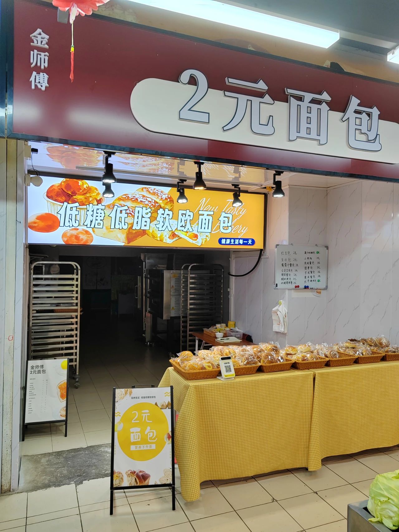 在装修风格上,2元面包店主打一个“简单粗暴”——店招通常是红底或绿底,加上“2元面包店”几个大字,十分醒目。这些店铺通常开在社区、学校周边或菜市场附近,往来人流量大,加上价格亲民、现烤出品相对慢,门店常常有顾客排队。