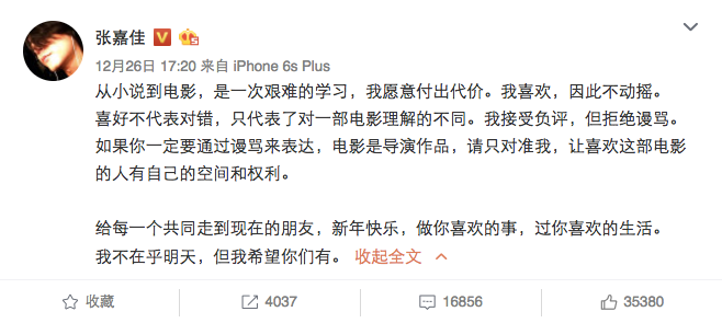 对此,张嘉佳在下午5点发布了一条微博,称“从小说到电影,是一次艰难的学习,我愿意付出代价。我喜欢,因此不动摇。喜好不代表对错,只代表了对一部电影理解的不同。我接受负评,但拒绝谩骂。如果你一定要通过谩骂来表达,电影是导演作品,请只对准我,让喜欢这部电影的人有自己的空间和权利。”