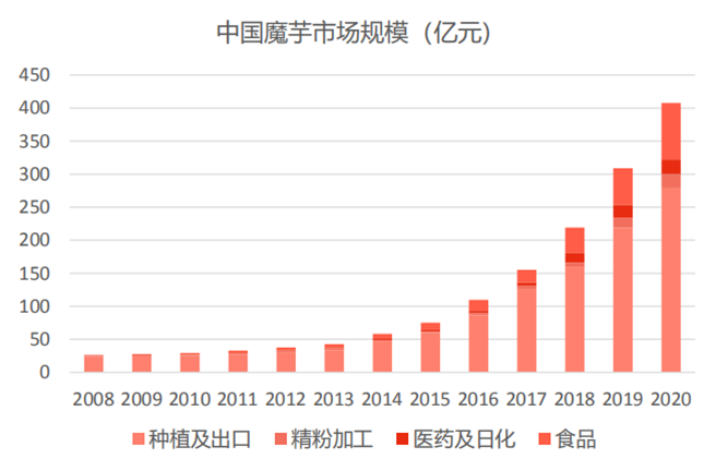 中国魔芋协会数据显示,2020年中国魔芋整体市场规模已经突破400亿元。2010-2020年,魔芋产业的复合增长率约为26%。在魔芋爽、蒟蒻、魔芋面等品类带动下,魔芋市场的丰富度有了很大提升。