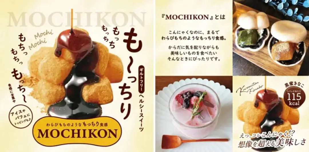 Marukin Foods在2021年推出了一款类似麻薯形态的口感软糯的黑蜜黄豆粉魔芋零食。产品将魔芋粉与多种类型的淀粉混合,具有独特的耐嚼而丰满的质地,搭配上细腻的黄豆粉和黑蜜,充满豆香味和蜂蜜香气。