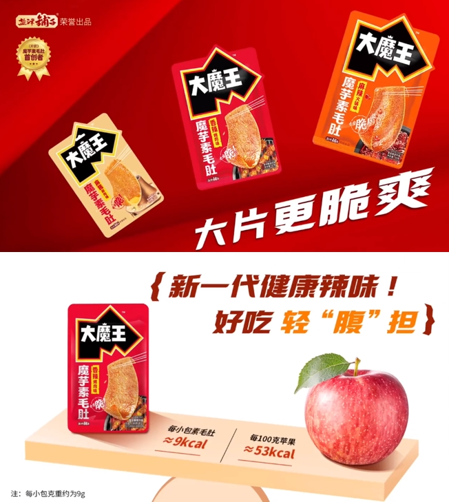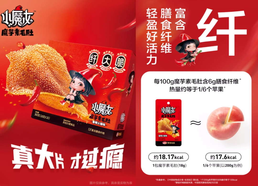10月,卫龙推出全新魔芋辣味休闲零食“小魔女”。基于对年轻消费群体的洞察,以及魔芋休闲零食在不同消费场景下的应用特征,卫龙在魔芋爽的工艺基础上,通过低温急冻技术升级素毛肚的脆感,并提供了“35×35mm”更大片素毛肚的口感体验,每100g魔芋素毛肚含6g膳食纤维。