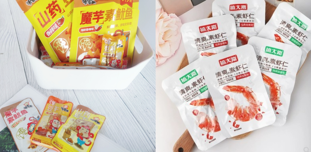 除了上述品牌,一致魔芋等魔芋加工企业,良品铺子、佳龙、好巴食、劲仔、口水娃等休闲零食品牌,都在魔芋零食赛道有所布局。在产品形态上,也开始创新推出大辣片、魔芋素鱿鱼甚至魔芋素虾仁等形式更多样的产品。