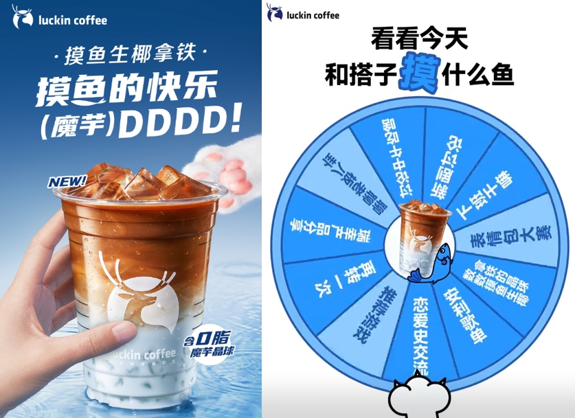 此外,魔芋还以魔芋晶球、水晶冻粉等形态更多样的茶饮原料形式得到更广泛的应用。今年4月,瑞幸就推出把魔芋放入拿铁的新品,借用“摸鱼”的谐音梗营销,将0脂魔芋的概念成功传达给年轻人。