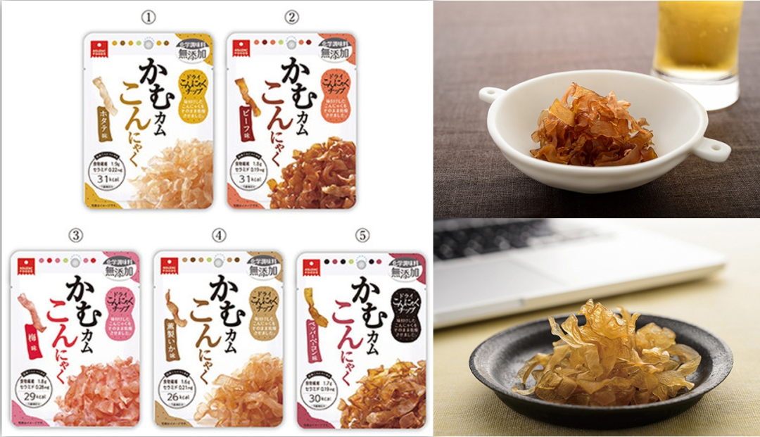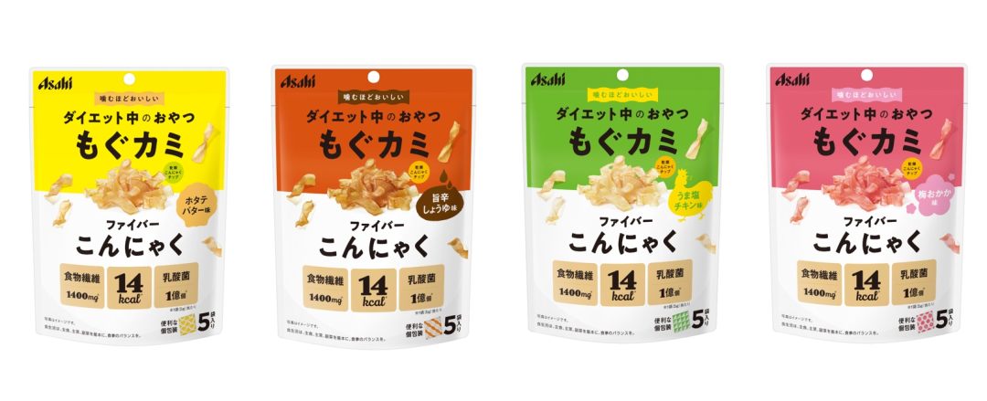 2019年,朝日推出一款有助瘦身的Mogu Kami Fiber Konnyaku干魔芋条,适合作为减肥节食人群的解馋零食。产品由魔芋调味干燥制成,富有嚼劲,体积较小便于携带。全系列包含鲜味辣酱油、鲜味鸡肉味、黄油烤扇贝等口味。每袋5g,热量约14kcal,富含膳食纤维和乳酸菌,有助于促进肠道消化。