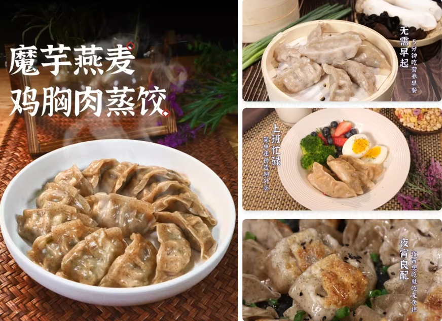 比如,野人日记在今年8月上新了一款魔芋燕麦鸡胸肉蒸饺。将魔芋、燕麦这两种饱腹感较强的主食和低脂鸡胸肉组合,让健康减脂原料以国民喜爱的饺子形态呈现,并添加藤椒调味,让减脂体验更日常、也更有滋味。