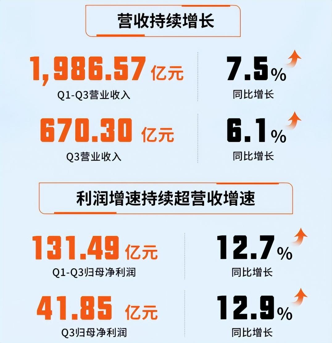 再来看海尔智家。第三季度实现收入670.31亿元,同比增长6.12%;归母净利润为41.85亿元,同比增长12.92%。除冰箱、洗衣机、水产业等优势业务份额持续提升外,家用空调、智慧楼宇、厨电等战略发展产业收入也实现较快增长。