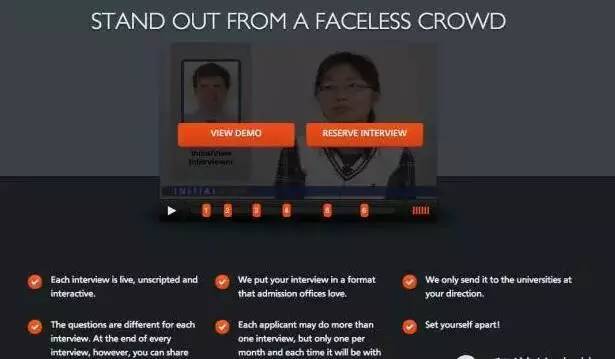 顾名思义,就是学校委托第三方面试机构来帮助其面试学生。这是近几年来逐渐流行起来的面试方式,而且越来越多以往不需要面试的美国大学也开始采取这种方式。比较常见的第三方面试机构有InitialView 和 Vericant。两者都是通过将面试录制成视频后,将视频发给学生查看,之后在学生授权的情况下,由机构直接发给学生申请的大学。需要注意的是,第三方机构是可以重复进行面试的,而且只有申请学生授权后,第三方机构才能把面试视频发送至学校。