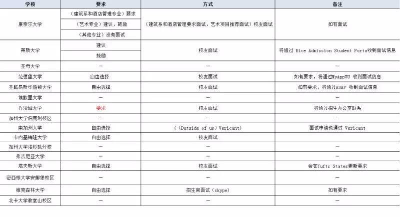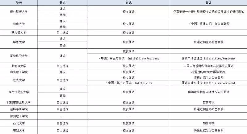 最后,我们整理了美国排名前30的综合性大学面试要求。面试并不是决胜的关键,录取的因素有很多。对于面试来说,把握整体面试战术才是重点,当然临场面试能做到不紧张也相当关键。