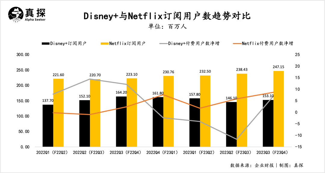经历了连续三个财季的订阅用户数流失后,本季度Disney+终于重回增长,新增近700万订阅用户数,目前总用户数达1.53亿。但距离前任CEO鲍勃·查佩克设定的2024年达到2.15亿到2.45亿的用户数目标,还差数千万。而反观迪士尼的老对手奈飞,目前奈飞的全球用户数已达2.47亿,巨大的用户基数下还保持了五个季度的新增正增长。
