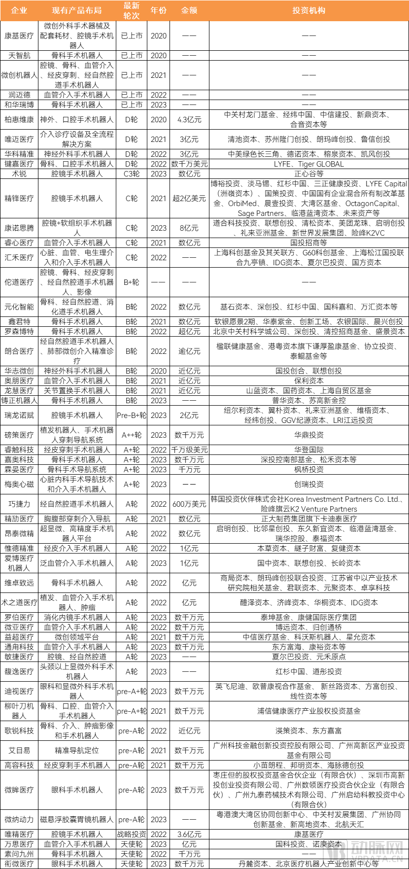 图表 2020年以来手术机器人公司融资统计 数据来源:各公司官网等公开信息