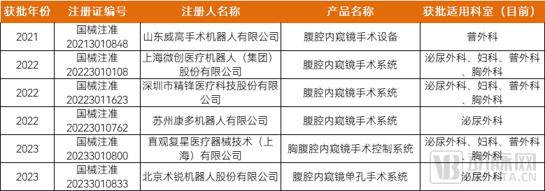 目前国内获NMPA批准(境内)的腔镜手术机器人共6家,整体获批在数量上实现逐年突破。