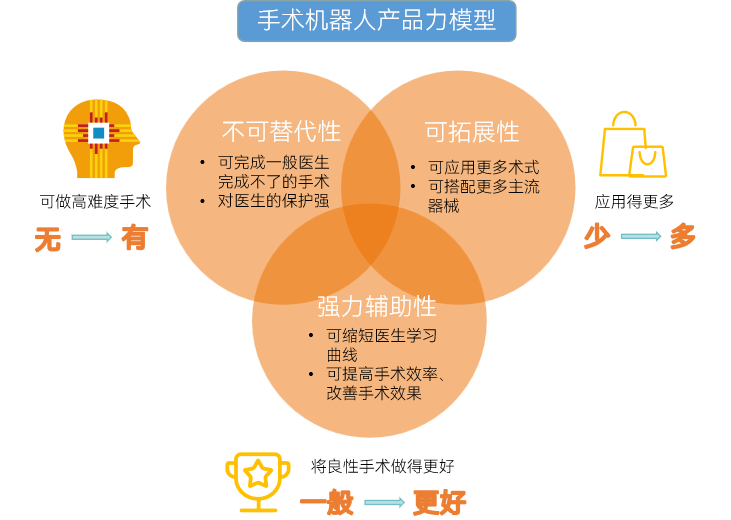 在应用上,产品力即手术机器人实现核心价值是根本。我们认为,手术机器人的产品力主要包括三个方面:不可替代性、强力辅助性、可拓展性。