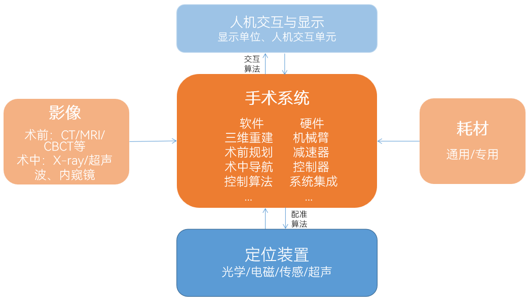 手术机器人具有多学科融合、技术壁垒高的特点。整体来看,手术机器人的功能模块分布如下: