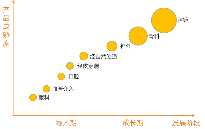 目前,除了达芬奇的腔镜手术机器人外,多数手术机器人还在“专科化”的阶段。全球手术机器人产品成熟度和发展阶段如下图,圆圈大小代表现有市场规模。