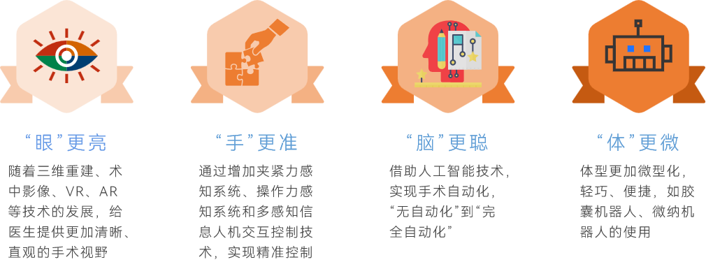 从更长远来看,微型化是手术机器人的另一个发展趋势,先是“体型”更轻巧、使用更便捷,再到胶囊机器人、微纳机器人的发展,进一步推动手术无创化,实现“体”更微。