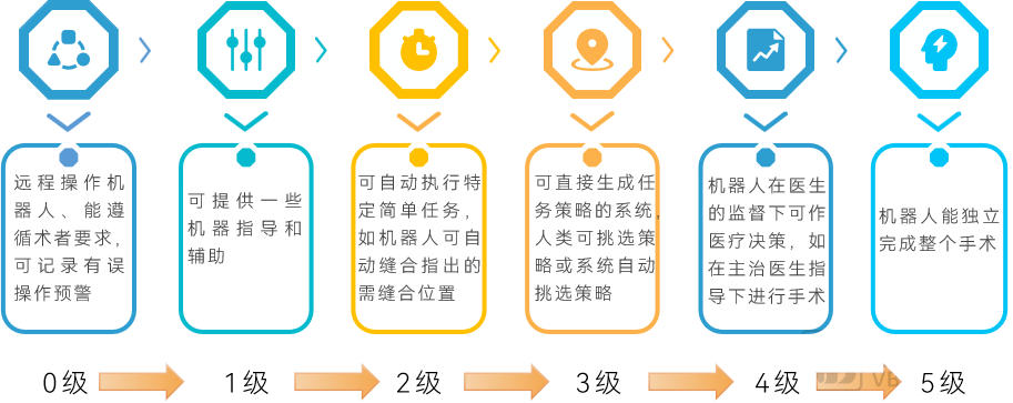 另外,手术机器人迈向自动化和智能化是必然,接下来将向自动化2级和3级迈进,并在技术上做复合,比如复合0级、1级和部分的2级共同迈向第3级。