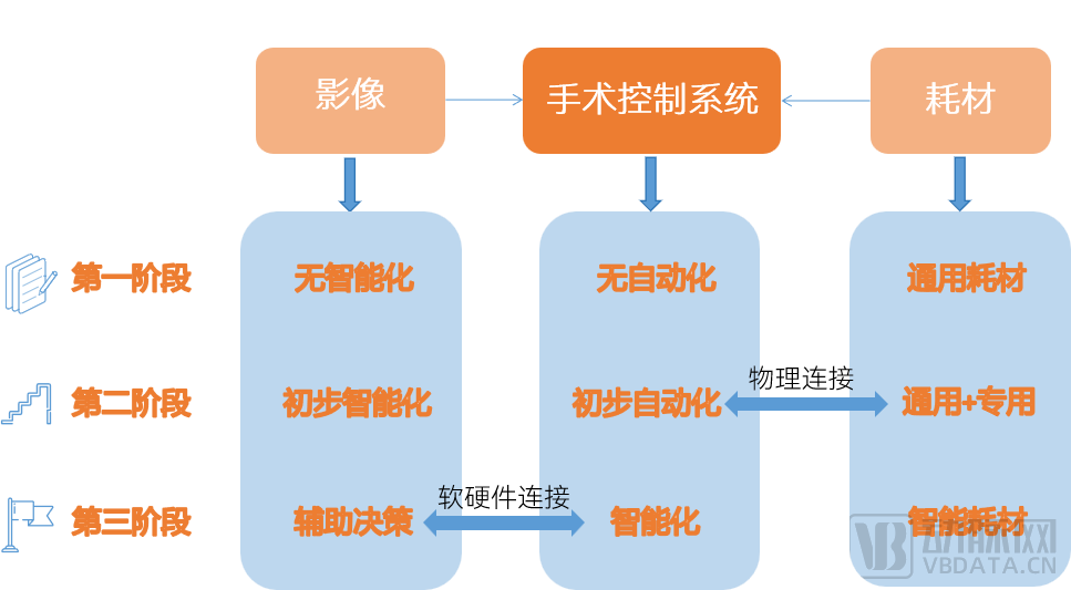 目前这个阶段更多是操作类复现,影像没有实现智能化,耗材也是通用耗材;第二阶段,影像引导定位,初步实现智能化,耗材有通用和专用,而耗材和手术系统的连接是物理连接;到第三个阶段,图像更加智能化,和手术系统可实现软硬件连接,并且有智能耗材应用,如传感器、芯片等,当然,这个过程可能比较久远。