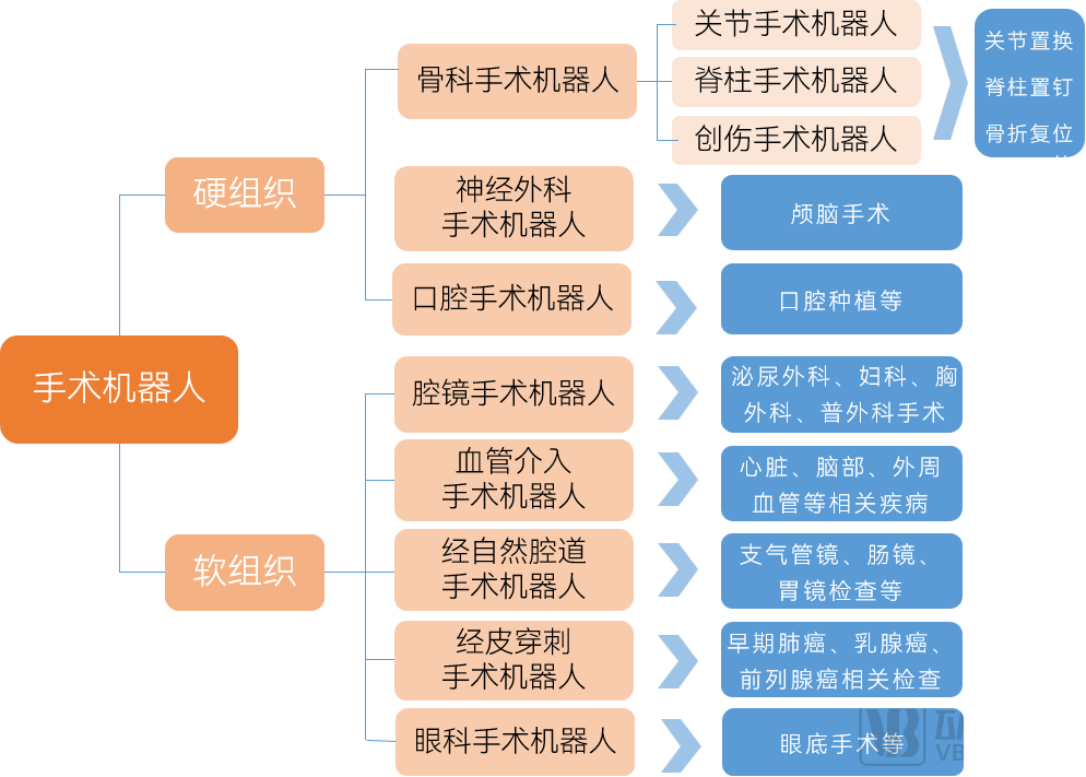 手术机器人是集临床医学、生物力学、机械学、计算机科学、微电子学等诸多学科为一体的新型医疗器械,通过清晰的成像系统和灵活的机械臂,以微创的手术形式,协助医生实施复杂的外科手术,完成术中定位、切断、穿刺、止血、缝合等操作。按照手术目标脏器类型,手术机器人可分为硬组织机器人和软组织机器人。