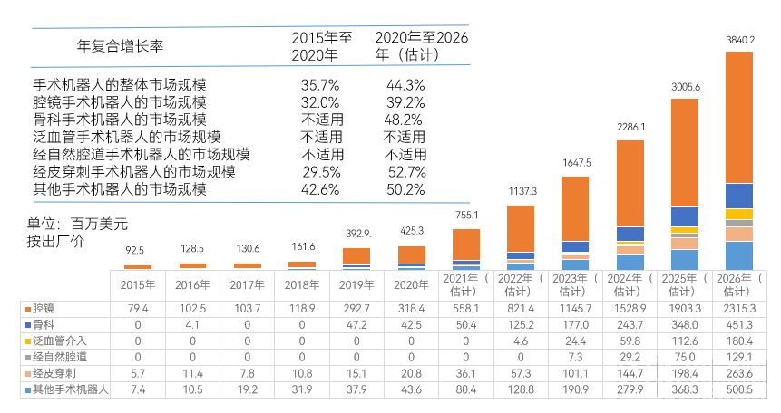 据沙利文数据披露,2020年,国内手术机器人市场规模达到4.3亿美元,复合增速为35.7%;估计到2026年达到38.4亿美元,全球2020-2026年复合增速预计为26.2%,国内为44.3%,超过全球18.1%,国内市场潜力巨大。其中,预计到2026年,腔镜手术机器人市场规模将达23.2亿美元,骨科手术机器人将达4.5亿美元。具体如下: