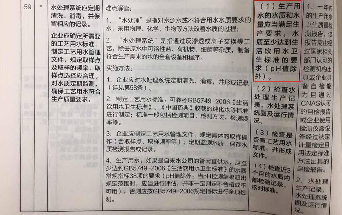 “两证合一”的《化妆品生产许可工作规范》,对于化妆品生产用水有明确要求:水质至少达到生活饮用水卫生标准的要求(pH值除外)。