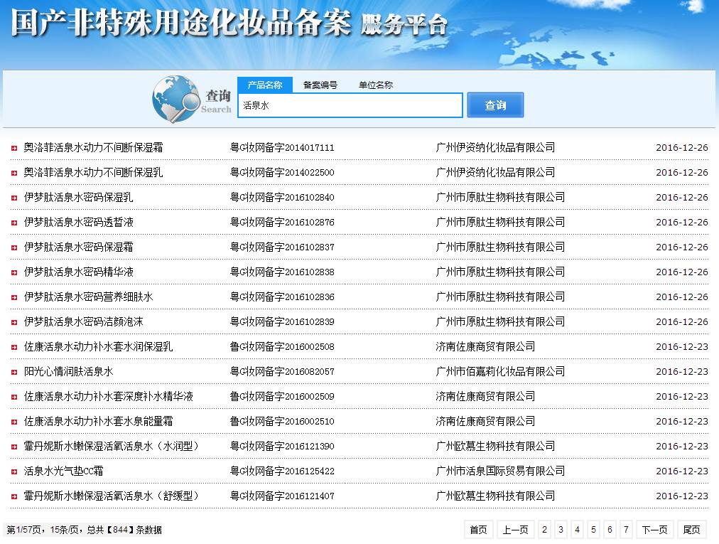 在国家食药监总局官网国产非特殊用途化妆品备案中,含“活泉水”、“冰川水”、“温泉水”的备案数分别为844条、363条、247条(截止到12月26日)。