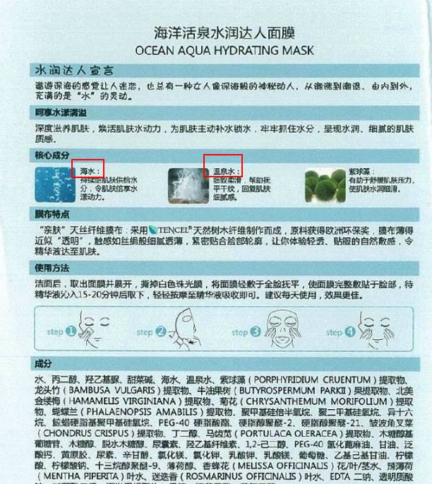 目前,化妆品成分表中的成分名称,依据的是《国际化妆品原料标准中文名称目录》(以下简称《目录》),在现行的2010版《目录》中,除了有温泉水、海水之外,并没有其他来源的水。
