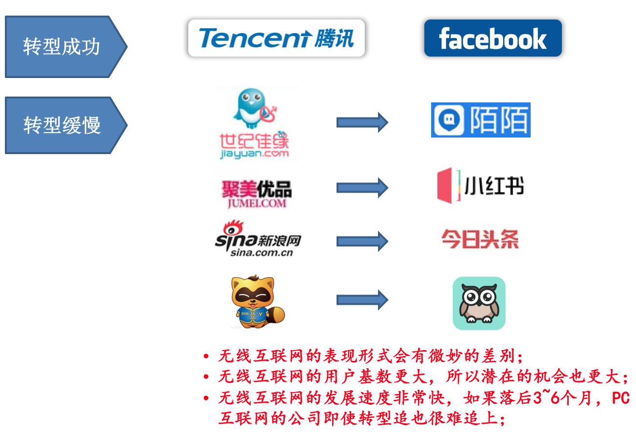 所以最现实的是要想,在 PC 互联网时代,到底哪些商业机会被证明了,然后在移动端会有哪些差异点——它们是新的机会所在。而且今天这个风口的机会就是三到六个月的时间,落后了就很难再追上。