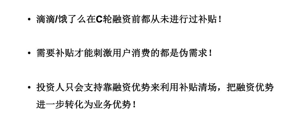 真正好的产品一定会获得强口碑传播,像滴滴、映客都是这样。早期用户不是补贴换来的,任何一个需要去补贴的用户都是伪需求,不是刚需。我们只喜欢用一种补贴,就是靠补贴来清场。当初滴滴打代驾、打拼车就非常典型的案例,靠资金优势来挤压市场,用补偿去清场。