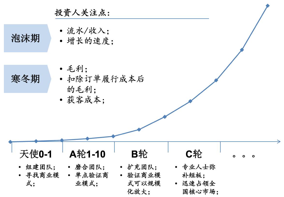 在 A 轮的时候,最重要的是找到正确的商业模式,至少从逻辑的判断上,这个商业模式可能可以成立;但是在获得 B 轮投资前,必须要确立可行的商业模式,B 轮投资人不可能为一个概念买单,必须要证明一个商业模式是成立的;C 轮投资是拿了 B 轮投资以后,再证明这个是可复制的,比如说A轮是在上海或者北京证明商业模式成立,C 轮时就要再扩张到二十几个城市。