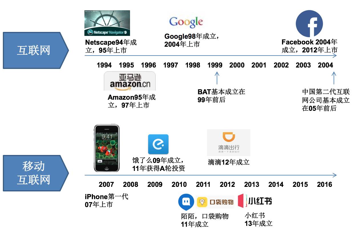 我们看历史,可以回到 PC 互联网、移动互联网的原点。如果我们把 1994 年的 Netscape(网景,第一个图形化的浏览器)看作是 PC 互联网的原点,再去看美国的三巨头成立的时间点:亚马逊是 1995 年成立的,因为它作为电子商务,要利用很多互联网的基础设施;谷歌 1998 年成立,因为谷歌是做搜索的,互联网上有了相当多内容以后,才能够做搜索;Facebook 是 2004 年成立的,这也很自然,因为 Facebook 是做人的连接,必须要等到网民数量达到足够丰富以后。