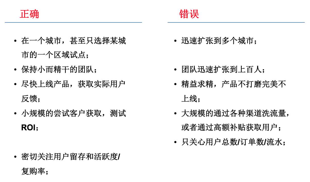 第三个误区就是很多创业者在初始的时候就一下去获取很多用户。但即使你有资源,即使你不用花钱去获取用户,如果一开始让大批的用户失望了,再把他们招回来,成本可能要十倍以上。所以要尽可能在小范围内去实验你的产品,先导入几千个、几万个用户,去看他们的反馈、用户行为是怎么样的,然后再去逐渐放大。