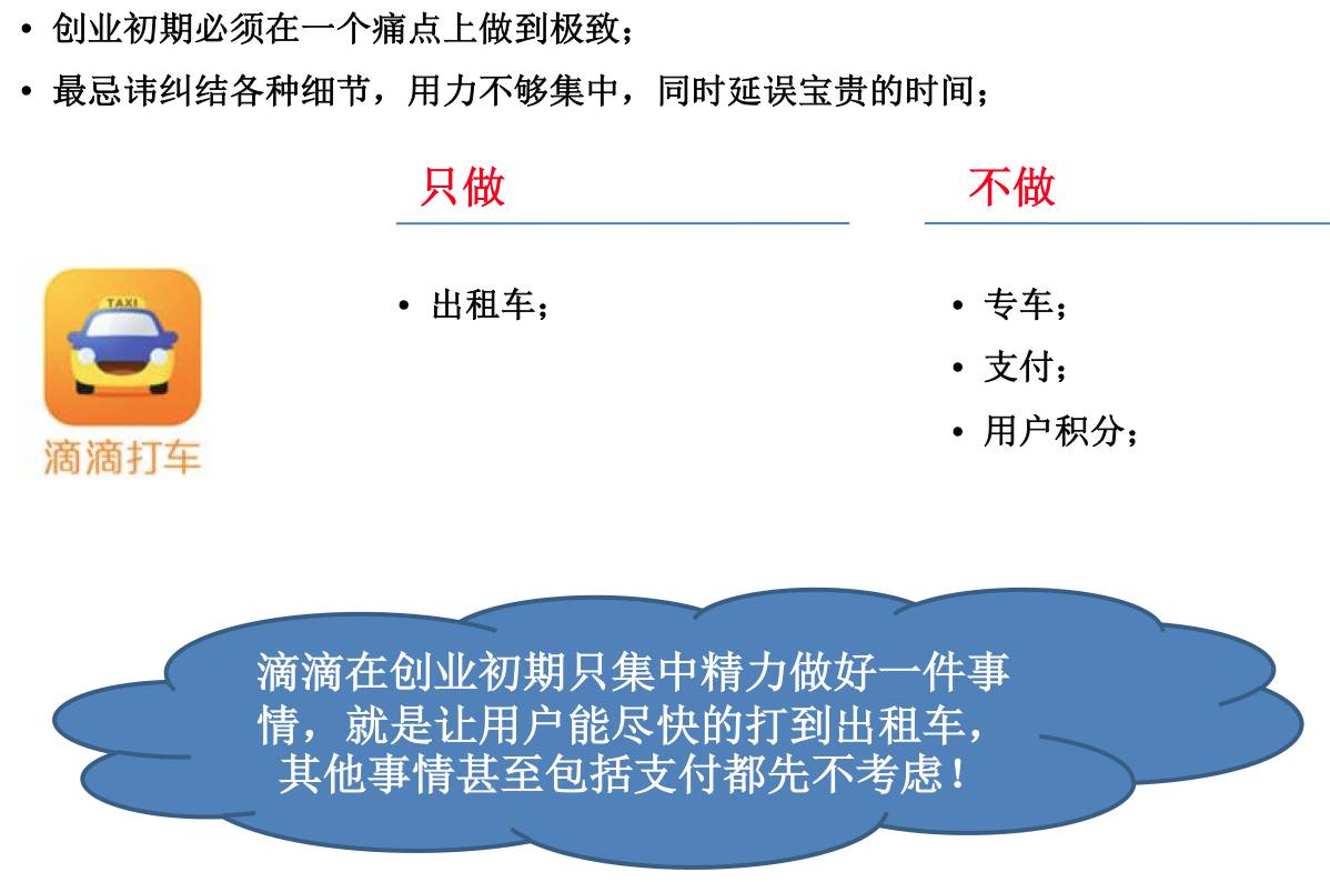 比如当初滴滴上线的时候,只做了一个非常简单的功能:用语音打出租车,而语音是没法做大数据分析的。但是正因为滴滴及时上线,才抓住那个风口:2011 年的七八月份上线,距离北京的冬天有三四个月的时候去获取市场,到了年底每下一场雪,用户就翻一番。但是如果滴滴追求十全十美,到了冬天才上线,他们就错过风口了。