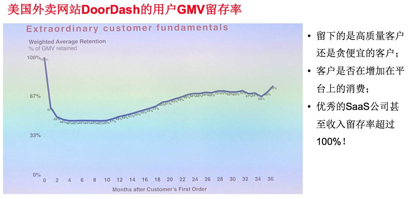投资人最喜欢看到的曲线就是,每一次版本的用户留存率都在提高,投资就会有很大的信心。比如一个企业三年前获取了 100 用户,这些用户当月花 100 美金;三年以后,这些留下的用户还能花 70 美金,这个数据是非常强大的。