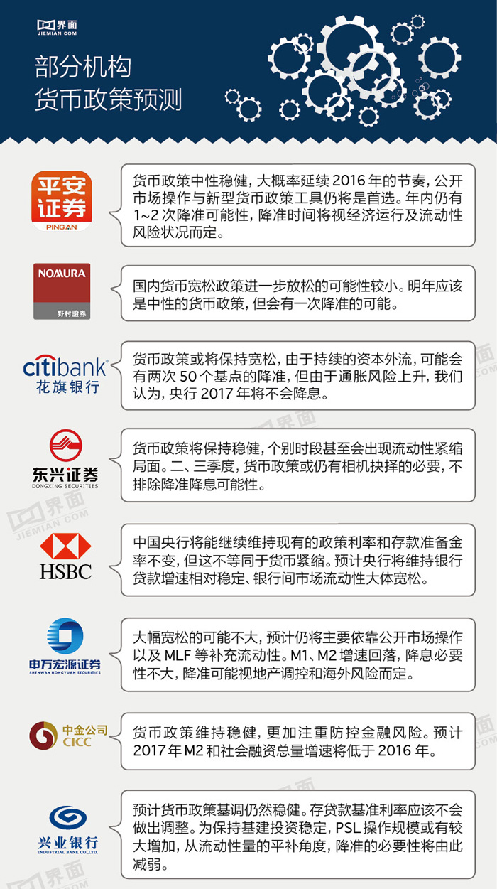 一些金融机构认为降准仍然可期,但另一部分认为货币政策已无继续宽松可能。中央经济工作会议为2017年货币政策定调“稳健中性”,多家机构判断,未来一年,货币政策维持“中性”、“稳健”,实际将较2016年有所收紧,流动性延续紧平衡,利率中枢有望抬升。不过,讨论“加息”还为时尚早。