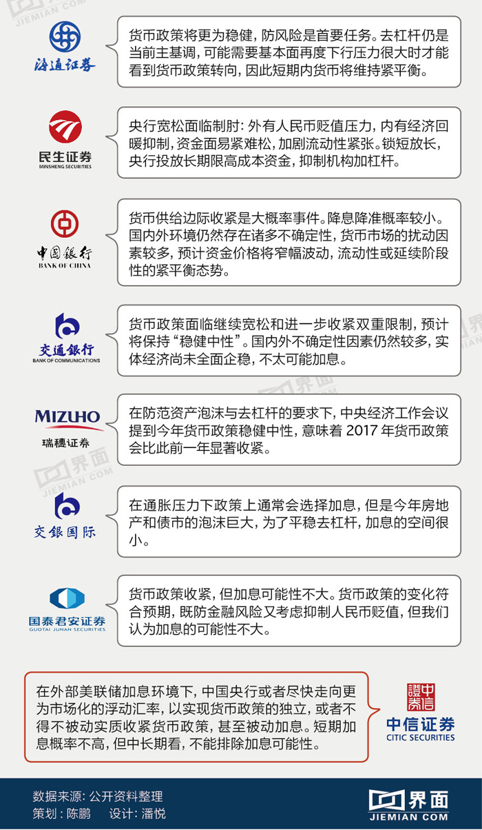 不过,从已知的几家机构观点来看,多数认为短期内加息可能性不大。2016年底,在美联储加息和人民币持续贬值背景下,市场上开始出现“加息”论调。但包括兴业证券、国泰君安、中国银行和交通银行等在内的一些金融机构认为,国内外不确定因素仍然较多,其中国内经济增速存在不确定是决定性因素。