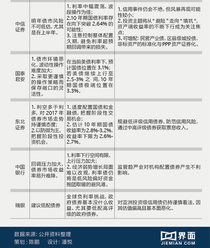展望2017年,机构对于经济增速、通胀和利率中枢回升程度等基本面因素判断分歧较大,对于监管趋严看法较为一致,多数认为明年债市仍存阶段性机会。中国银行提出三点利好,包括其判断:第一,经济弱势增长局面难以根本改观,利率债仍将是低风险偏好资金抱团取暖的避风港;第二,人民币加入SDR后,债券市场国际化纵深发展,国际投资者配置债券的意愿不会发生根本性变化;第三,债券产品创新继续提速,有利于将资本引入债券市场。以及,推动PPP项目与资本市场深化发展相结合等关政策的加速落地,有利于各类资本进入债市。