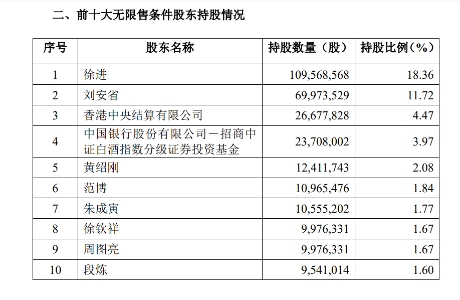 11月10日,口子窖进一步公布《关于回购股份事项前十大股东和前十大无限售条件股东持股情况的公告》,公布了登记在册的前十大股东和前十大无限售条件股东的名称、持股数量及比例情况。其中,徐进以18.26%的持股比例位居第一。
