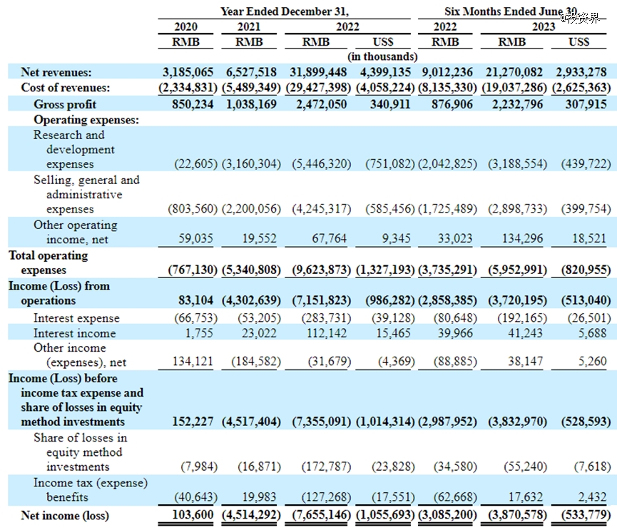 当然,亏损也是极氪不容忽视的问题。招股书透露,2020年至2022年,极氪净利润分别为1.04亿元、-45.14亿元和-76.55亿元。而今年上半年的净亏损为38.71亿元,去年同期则为30.85亿元。相对应的,极氪也在持续重注研发。2023年上半年极氪研发投入31.89亿元,同比增长56.09%,2021年至2023年上半年累计研发投入达到117.95亿元。