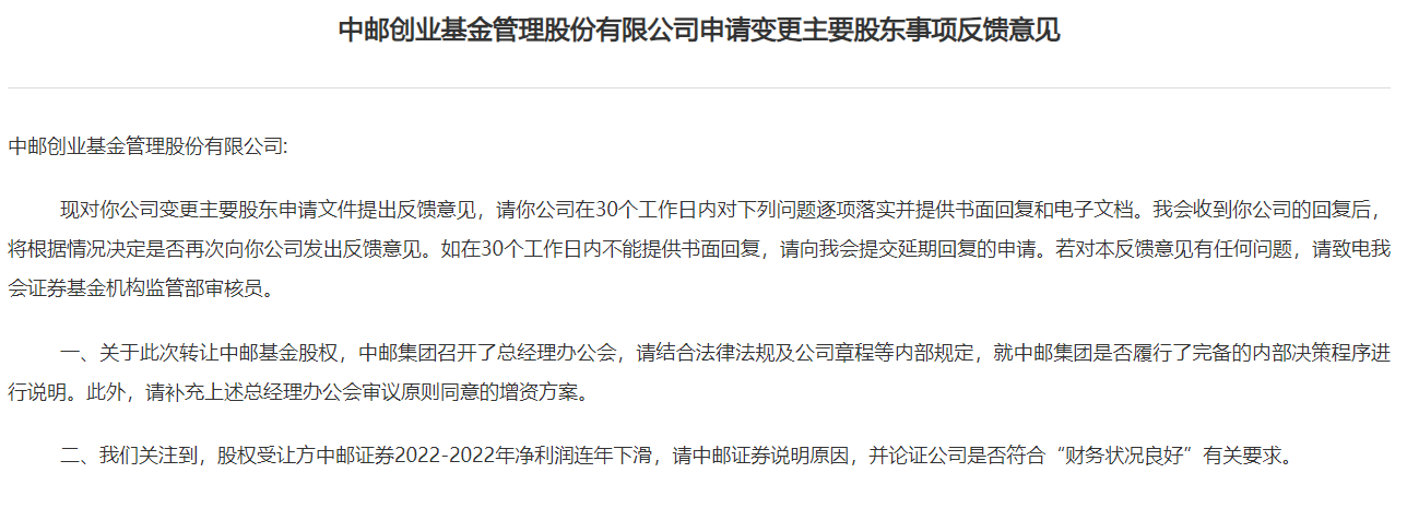 近日,证监会就中邮创业基金申请变更主要股东的事项反馈了意见。《意见》提到,中邮基金需要补充提供中邮集团总经理办公会审议原则同意的方案;由于股权受让方中邮证券净利润连年下滑,需要补充原因,并论证公司是否符合“财务状况良好”的相关要求。