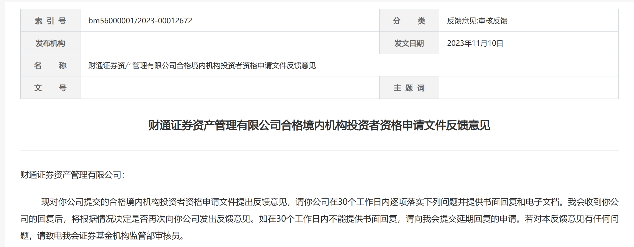 继今年7月份递交合格境内机构投资者申请后,11月10日,财通证券资产管理有限公司(下称:财通资管)收到证监会的反馈意见。