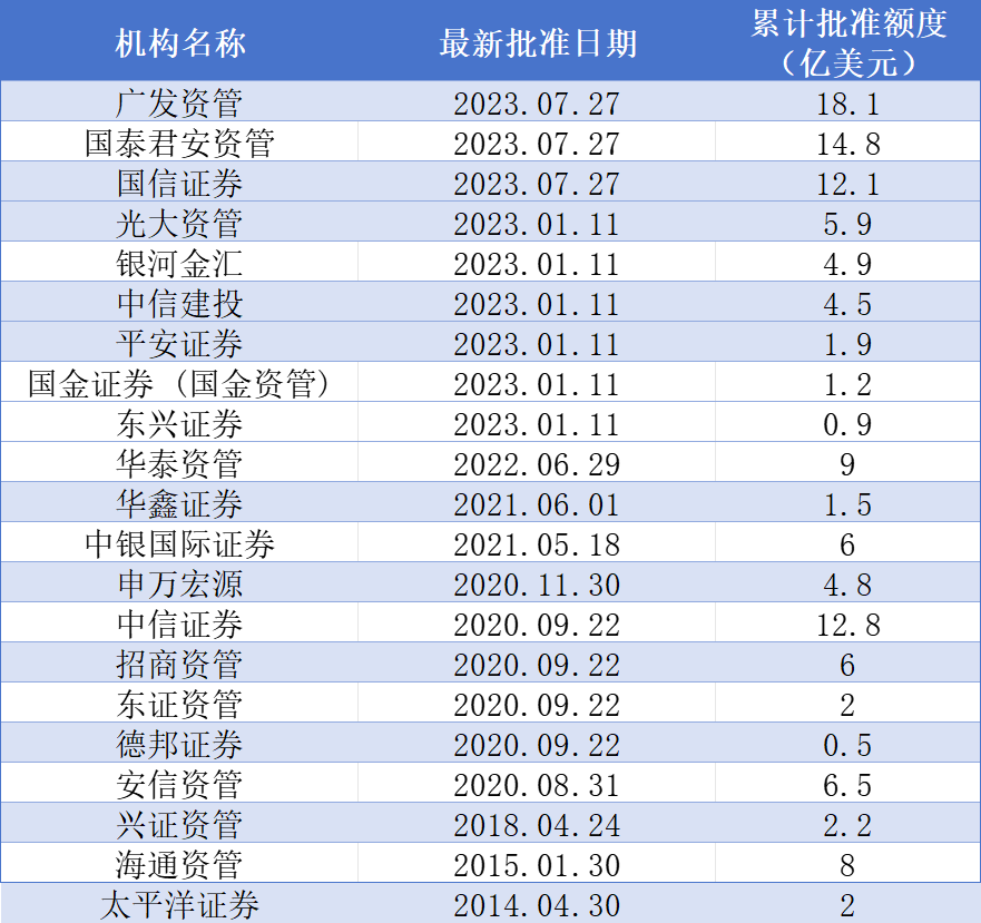 据界面新闻梳理,74家证券基金类机构中,截至目前,已有11家券商及10家券商资管拥有此业务资格。广发资管获批额度最高,达18.1亿美元,此外,国泰君安资管、中信证券和国信证券获批额度也分别超10亿美元,分别为14.8亿美元、12.8亿美元和12.1亿美元。