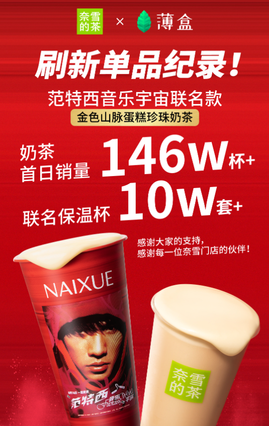 9月14日,奈雪的茶与薄盒App联合上线“范特西音乐宇宙”联名奶茶,首日全国销售量146万杯,创造了奈雪新品首日销量新纪录。