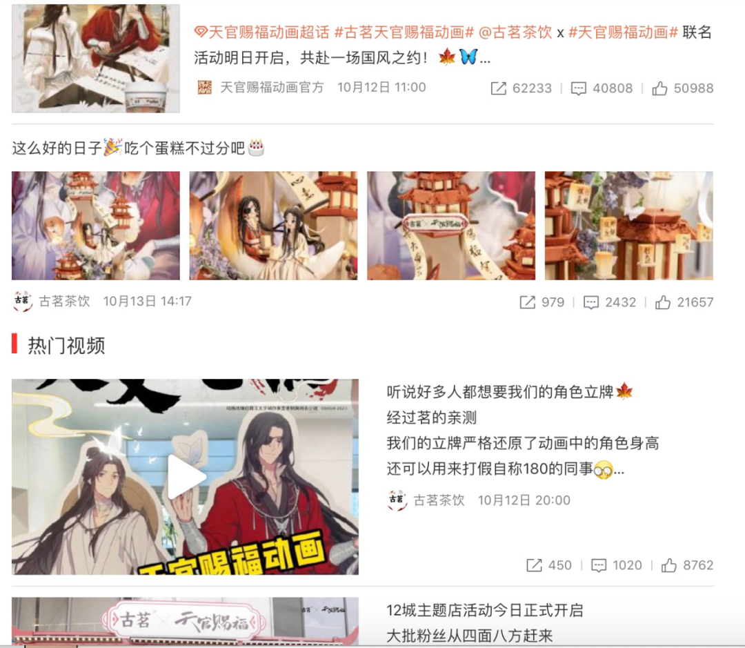 天官赐福动画官方,在微博官宣与古茗即将在10月13日开启联动的这条消息,更是转发超6万、评论超4万,点赞达到了5万。