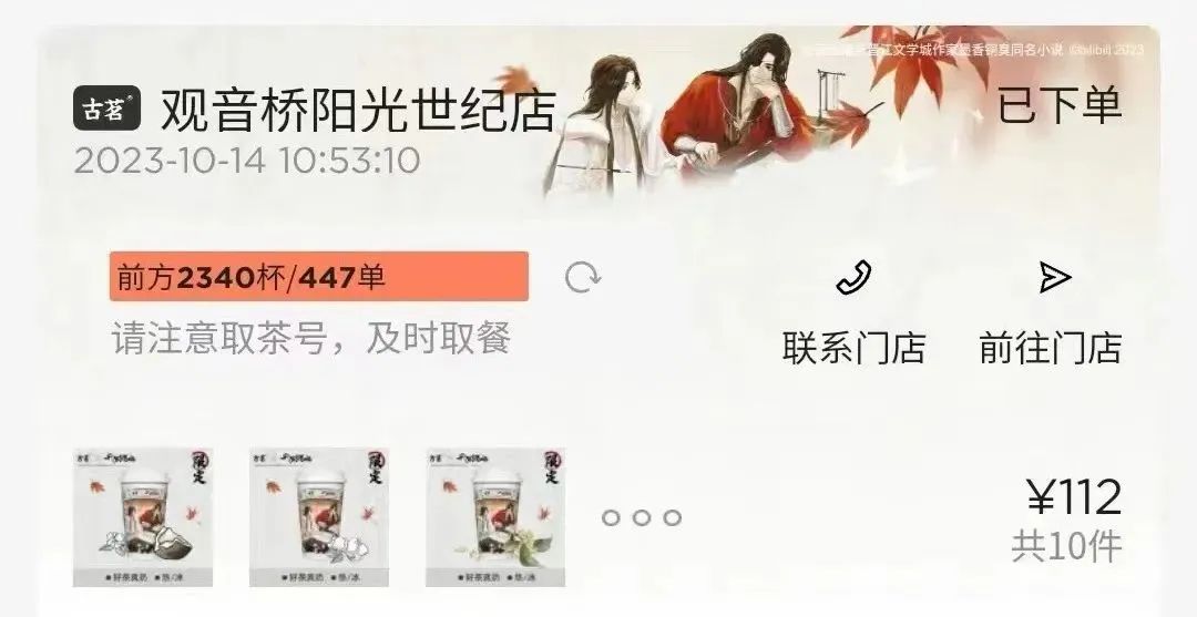 产品上线当天,古茗重庆、武汉、长沙、杭州、武汉等市的天官赐福主题店都排起了长队——“前方659杯/132单,制作中”“前方581杯/120单,制作中”都是小场面,许多店铺的排单量都超过了一千杯,部分店铺达到了两千杯的同时,新的订单还在以几十杯为一单暴增。