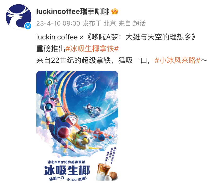 《哆啦A梦:大雄与天空的理想乡》就是一个例子。这部动画电影2023年6月1日在国内上映,瑞幸和电影的联名咖啡在4月就已上架,为电影的上映开启提前预热。
