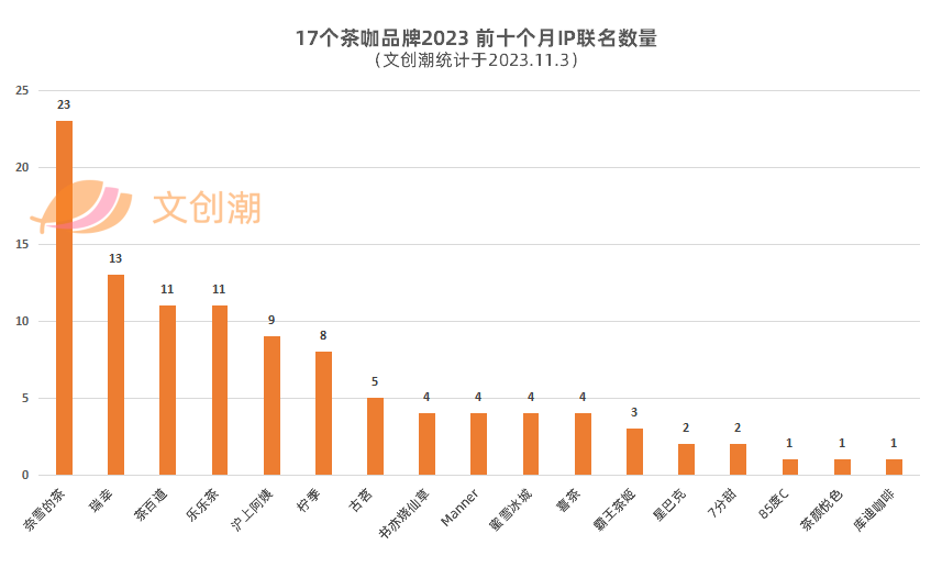 文创潮统计发现,奈雪的茶、瑞幸、茶百道、乐乐茶、沪上阿姨、柠季、古茗、书亦烧仙草、Manner、蜜雪冰城、喜茶、霸王茶姬、星巴克、7分甜、85度C、茶颜悦色、库迪咖啡17个代表性的奶茶和咖啡品牌店,在2023年前十个月的联名事件,超过了106起。
