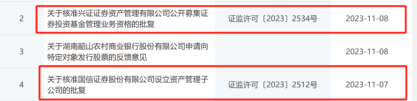 11月10日,证监会消息,国信证券获批设立券商资管子公司,兴证证券资产管理有限公司(兴证资管)获批公募管理人资格。两家机构的证监会核准日期分别为11月7日和11月8日,均于10日公示。