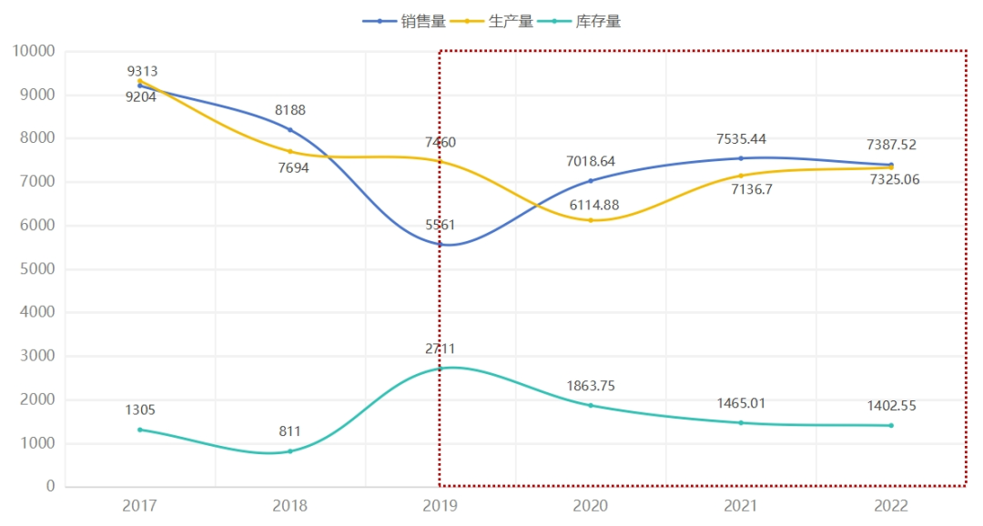 2019年销量下滑,生产量远高于销售量,随后2年,销量明显高于生产量;但到去年,生产量与销售量基本持平。我们可以简单理解为,公司认为目前的库存基本合理,否则大可以继续减少生产量,至少可以维持在2021,甚至2020年的水平上。
